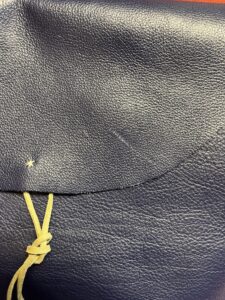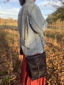 This hand-stitched cottagecore purse is made of buttery-soft navy natural grain cowhide leather with an olive suede wrap for a copper button. It has and adjustable 46” leafy strap and matching green-gold interior with a 6x7” cream floral pocket. The purse is 11.5 inches tall, 8.5 inches wide, and 2 inches deep. Note: the top does have a hairline scratch, hardly noticeable, but the price has been marked down for that flaw.